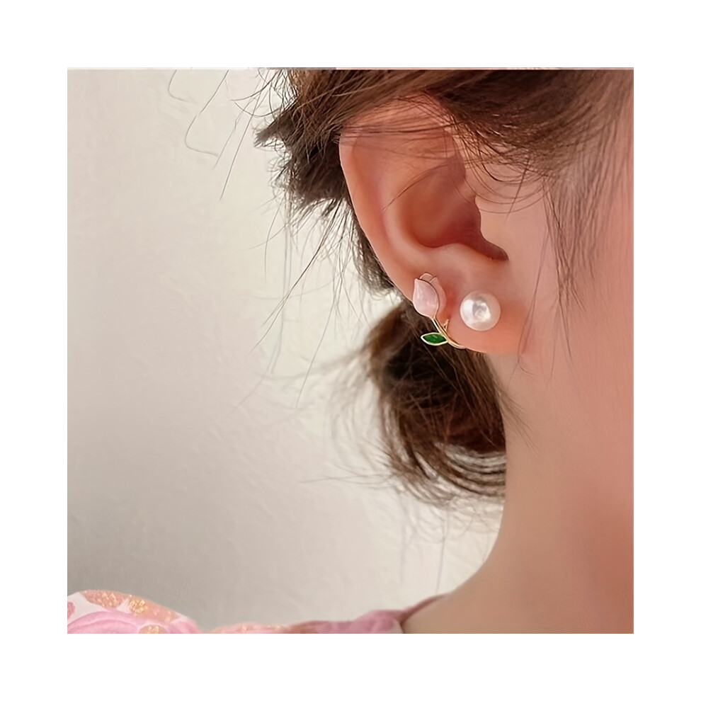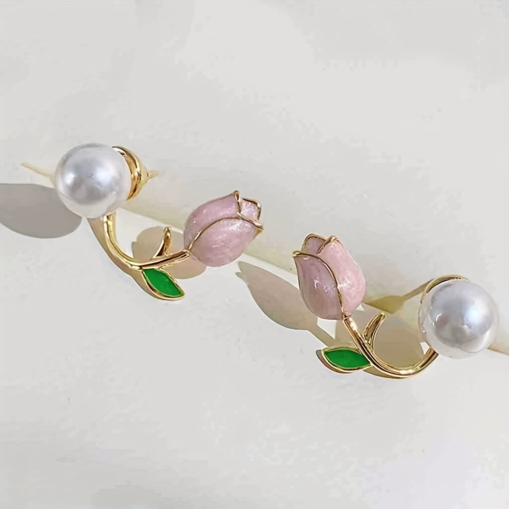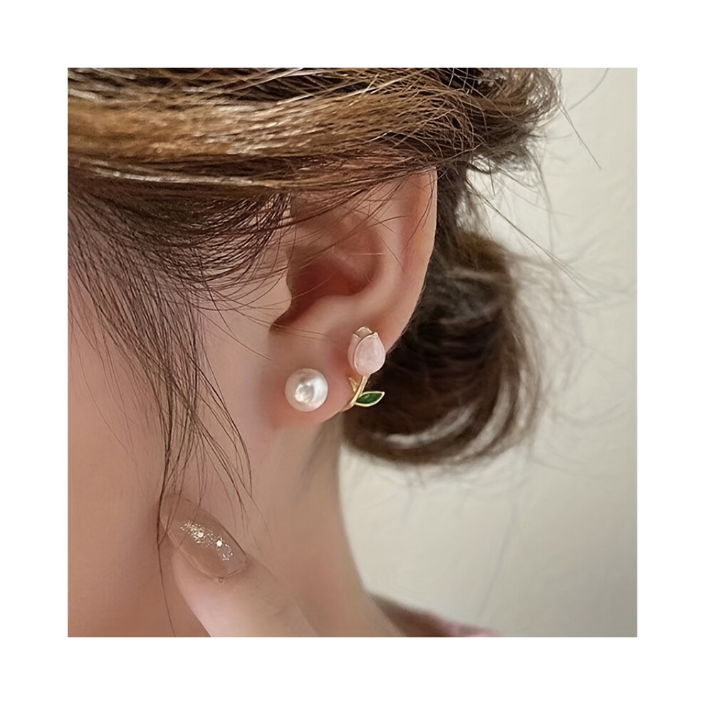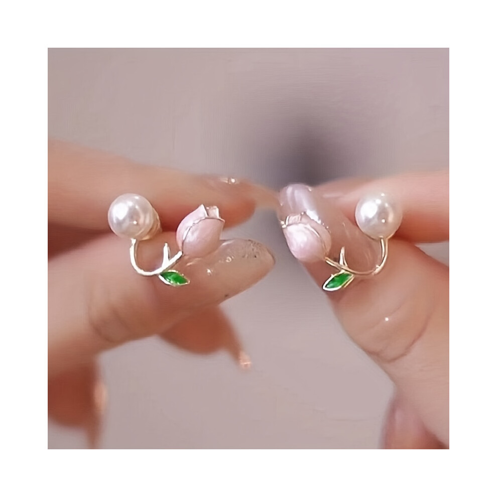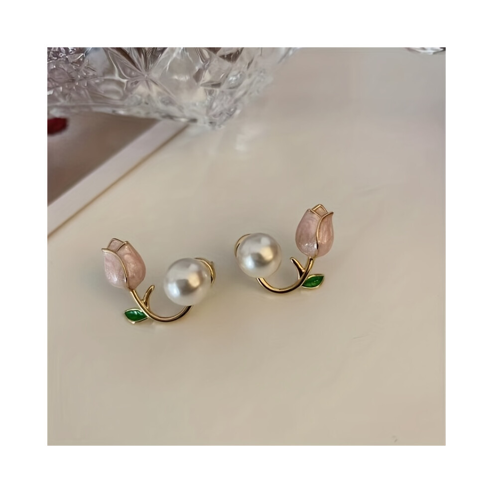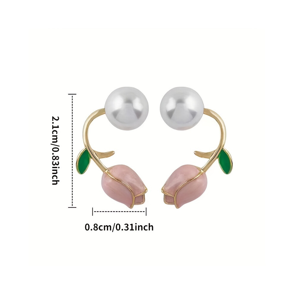 Elegant Pink Tulip Flower Pearl Stud Earrings for Women – Perfect for Daily Wear and Special Occasions – Great Gift for Christmas, Halloween