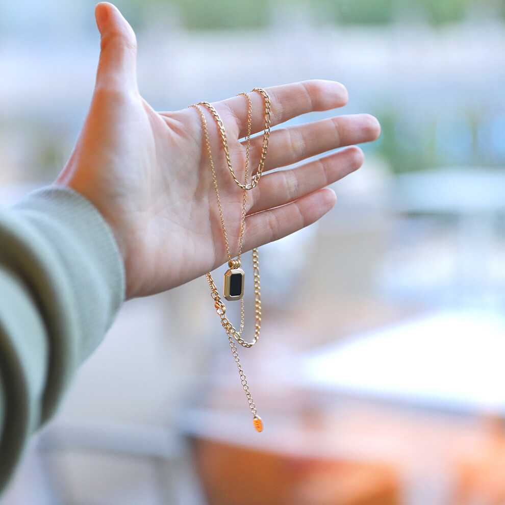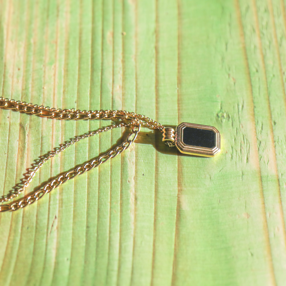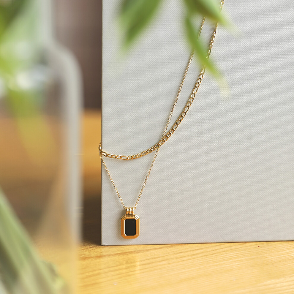 Layered Gold Necklace with Black Pendant | Figaro & Curb Chains Description