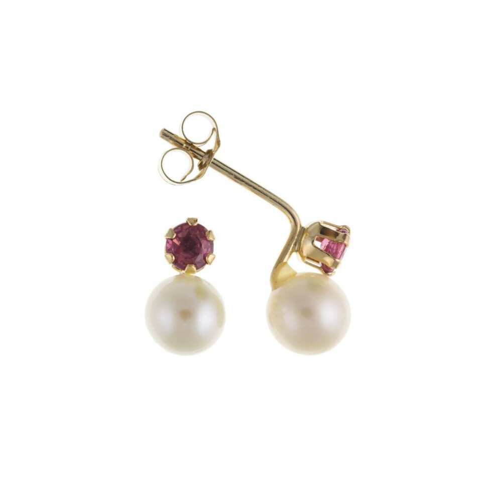 - Ruby and Freshwater Pearl Earrings Solid 9 Carat Yellow Gold Studs Natural Stone